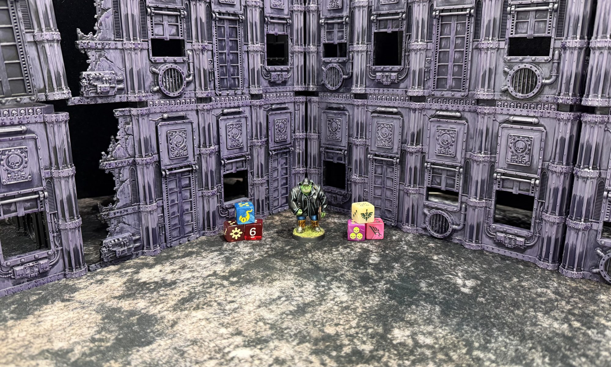 In‑house terrain and objective markers are provided by the Sector. These are official Games Workshop pieces intended to mimic the official layout as accurately as possible, ensuring a balanced battlefield without random factors. Acrylic footprints are supplied and follow the general footprint rules. All first‑floor building walls are treated as blocking line of sight. Light terrain features are defined as less than two inches in height. Units firing from the second floor do not gain a plunging fire bonus, and all units positioned on the second floor can be charged directly from the wall.